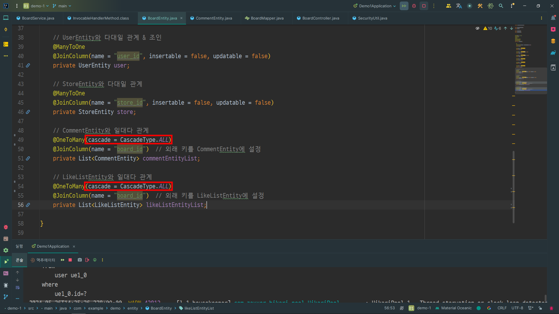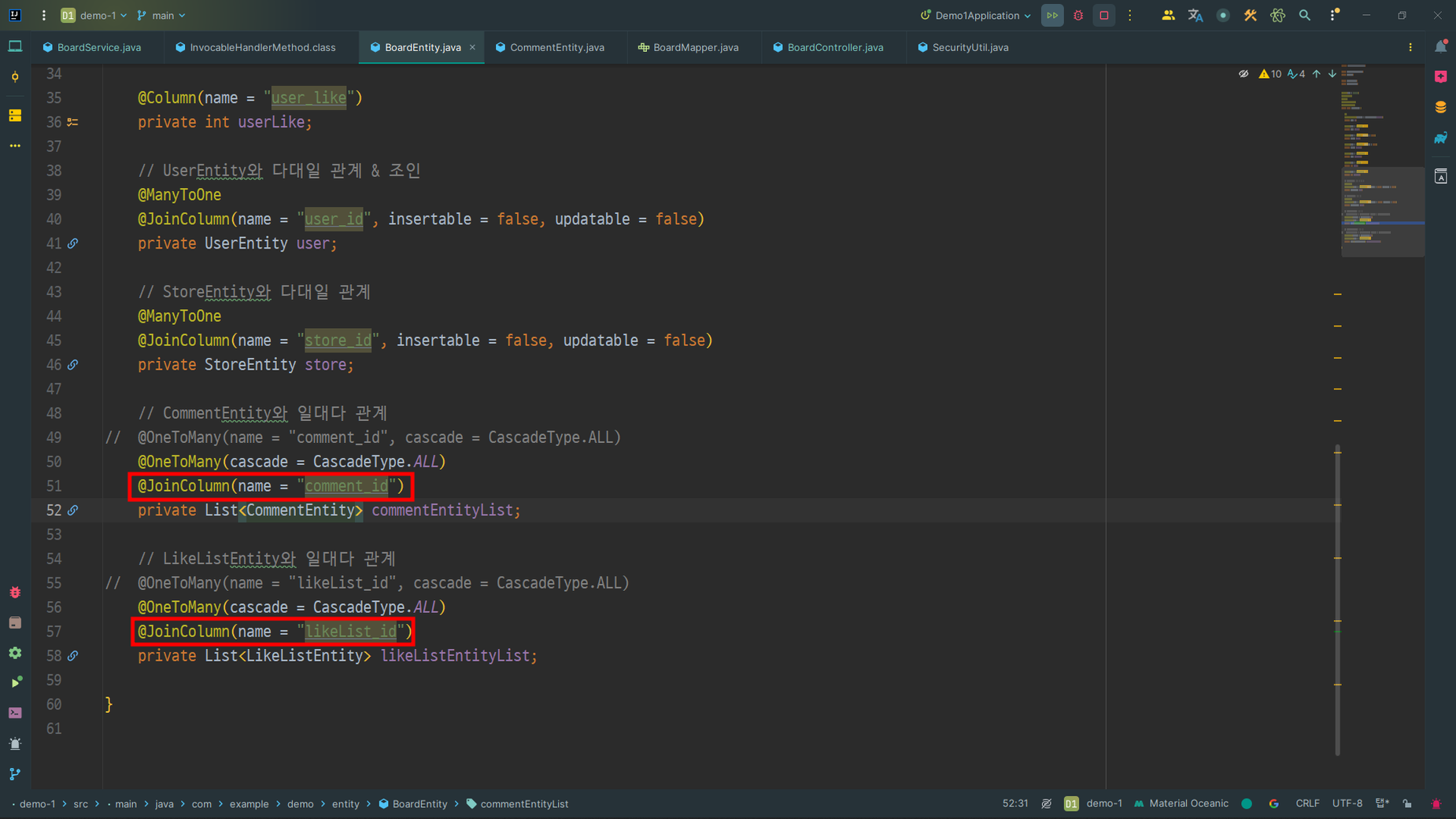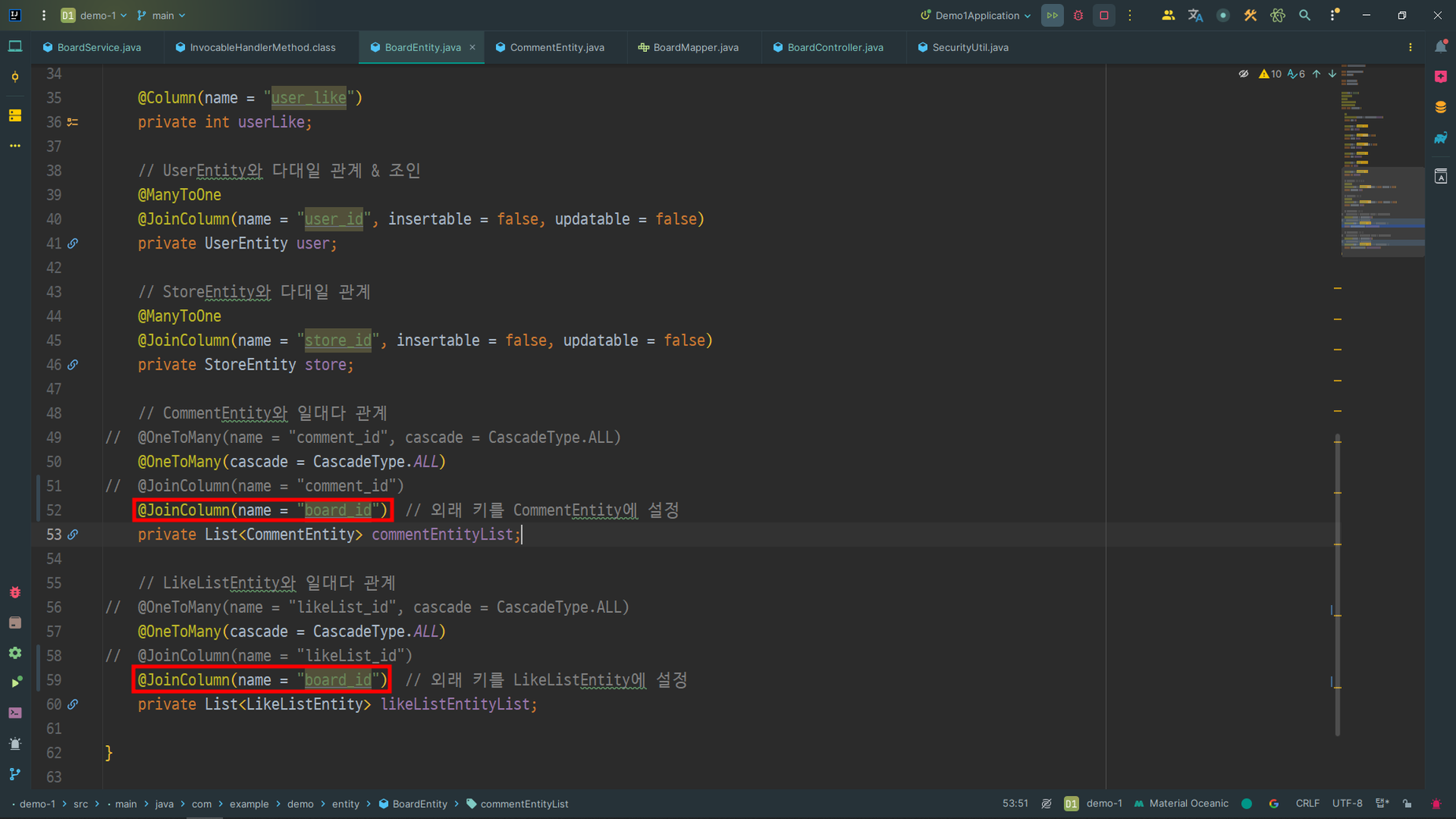 • BoardEntity는 CommentEntity 및 LikeListEntity와의 일대다 관계를 설정하고, 각각의 엔티티에 board_id 외래 키를 @JoinColumn을 사용하여 명시적으로 지정합니다.