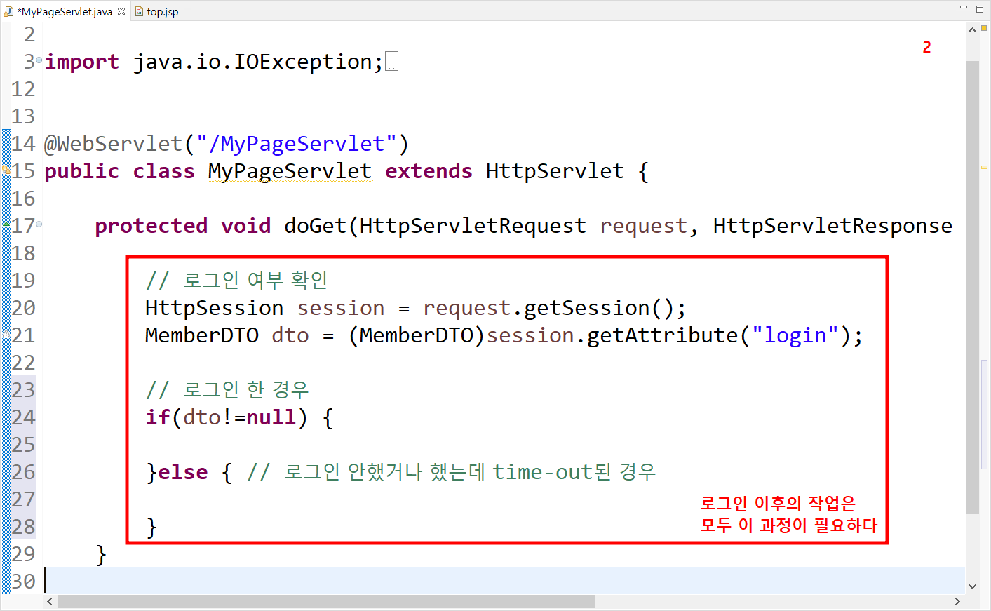 ✅ MyPageServlet에 로그인 여부 확인 코드 작성 => login 키를 dto에 담는다.