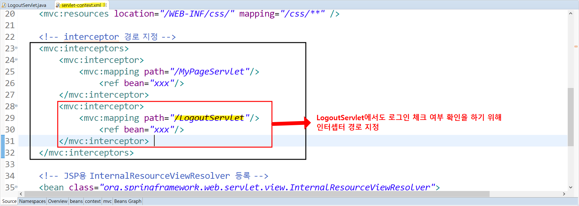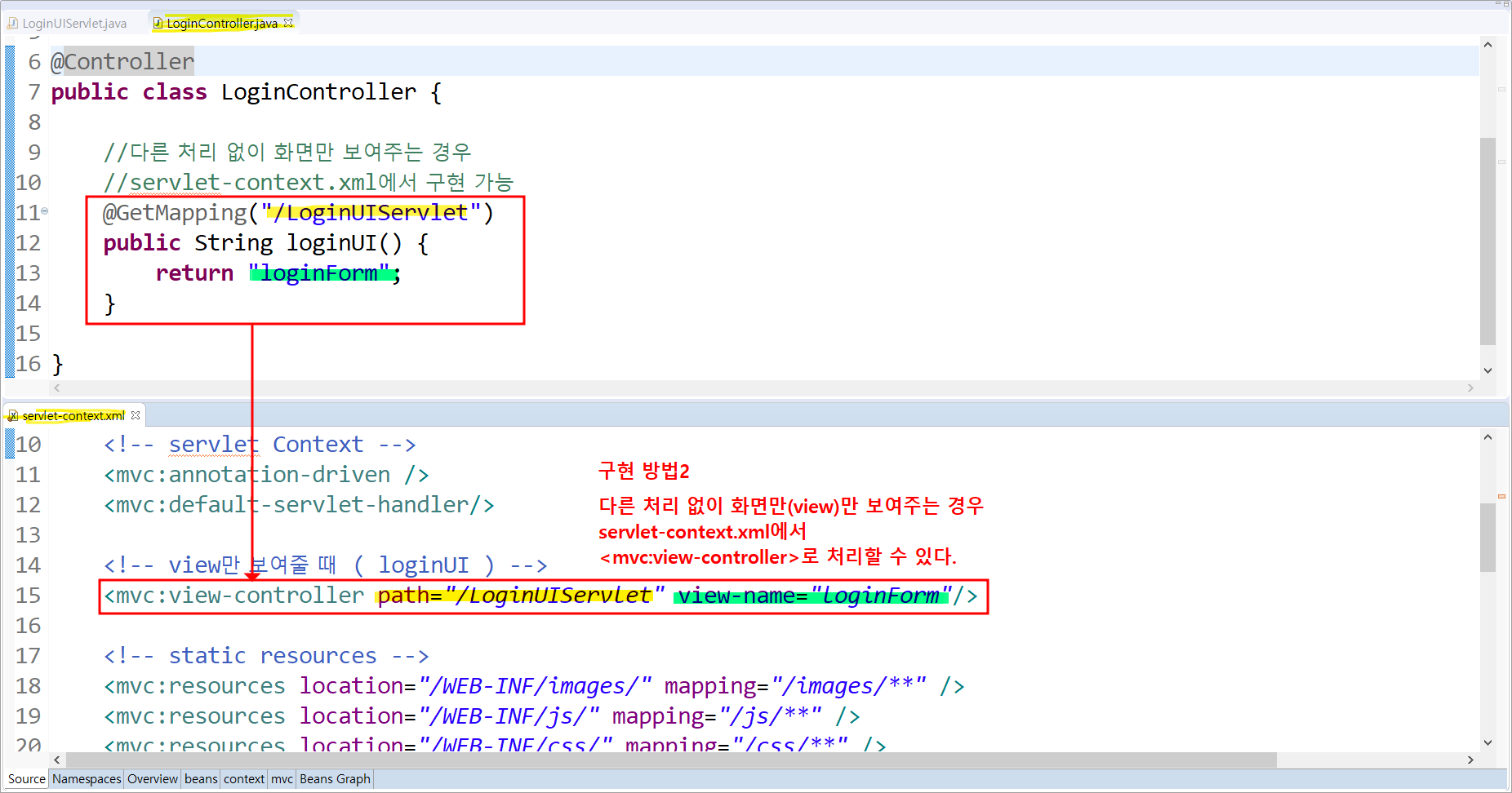 이런 경우 Controller 클레스에 일일이 @RequestMapping이 선언된 메소드를 구현하여서 JSP를 띄우는 것이 아니라, servlet-context에 jsp의 경로에 대한 선언만으로 url과 jsp를 매핑시키는 밥법이 있다.