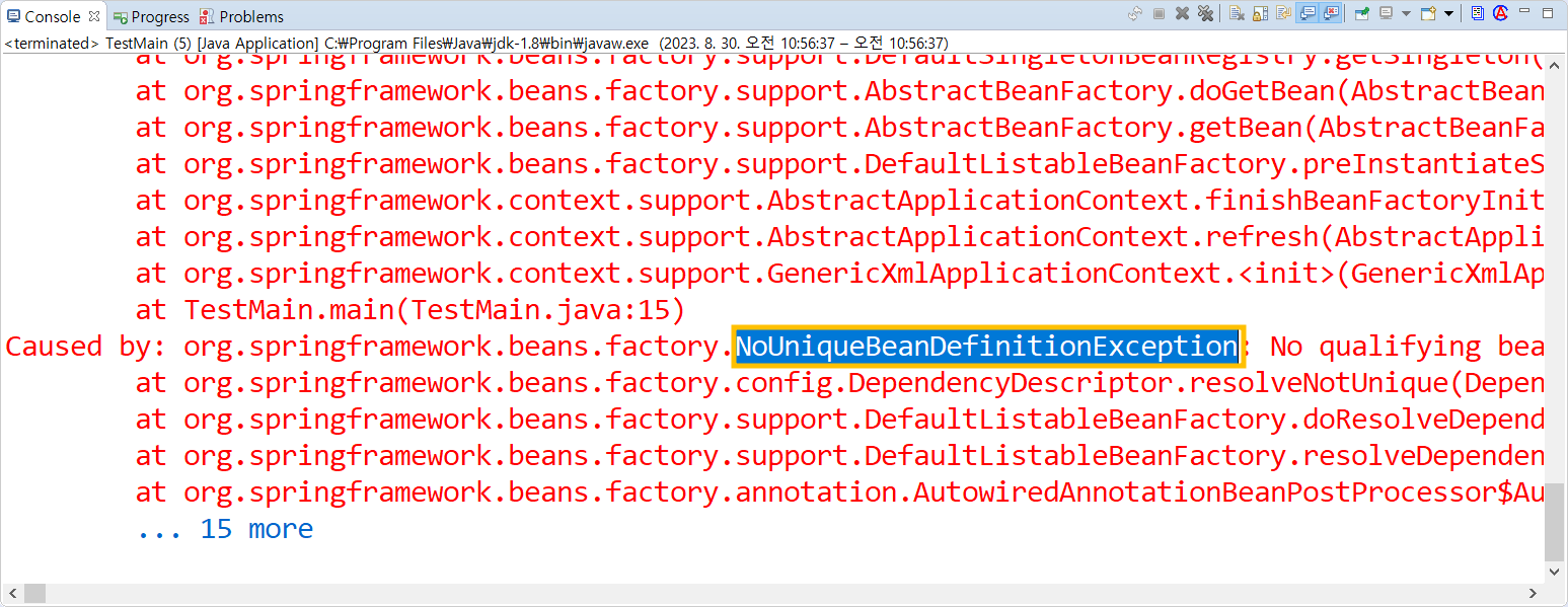 타입(type)으로 찾아서 주입하기 때문에 만약 동일한 타입이 여러 개인 경우에 발생한다.