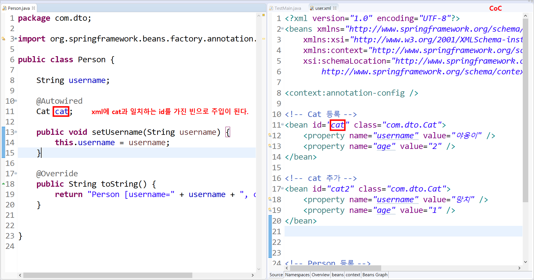 Cat cat; ⇒ xml에 cat과 일치하는 id를 가진 빈으로 주입이 된다.