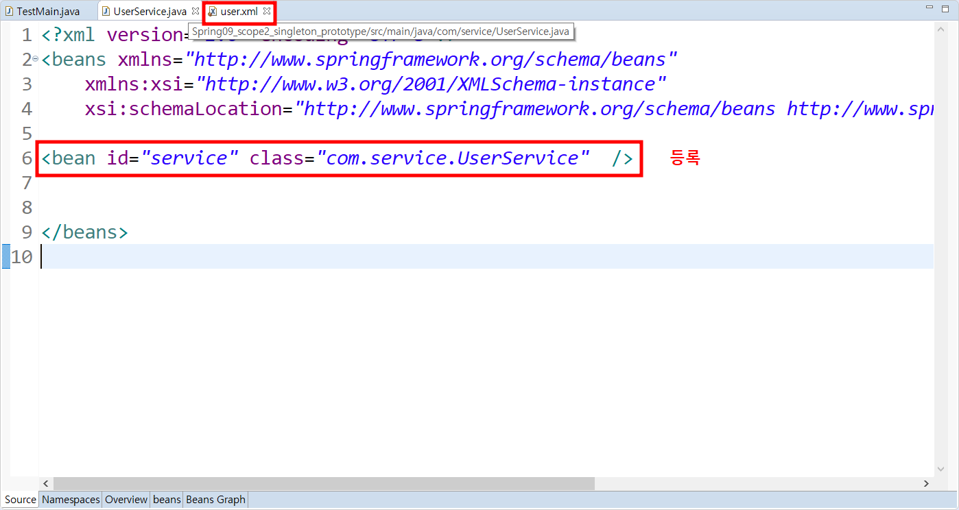 ⇒ 여러 사용자가 하나의 빈을 공유해서 사용하게 된다. - scope=”prototype”