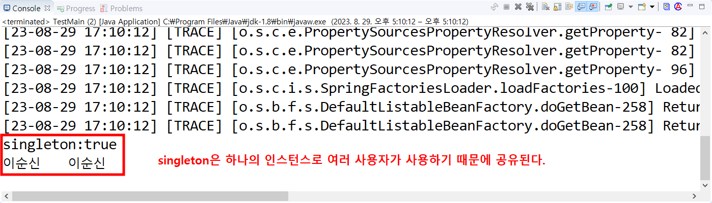 ⇒ 필요시 getBean()할 때 이전에 생성된 빈을 반환 ⇒ 따라서 하나의 빈으로 재사용한다.
