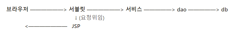- client 요청에 대한 처리는 Servlet이, logic 처리는 java class (Service, Dao, ...)가 담당하고 JSP는 view에 대한 처리만 수행한다.