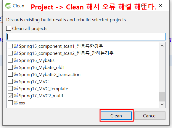 Project -> Clean 으로 들어가 두어번 Clean을 해준다