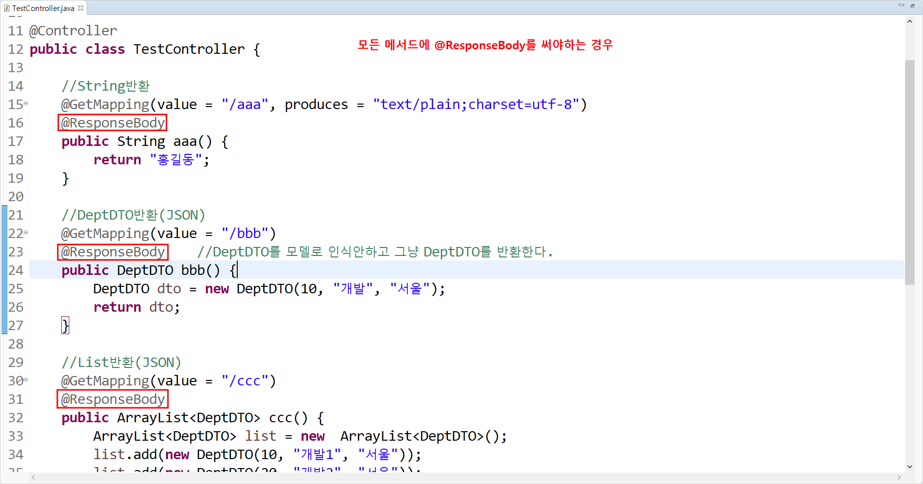 AController의 모든 메서드(10개 가정)가 @ResponseBody를 사용한다면 10번 @ResponseBody 지정해야 된다.
