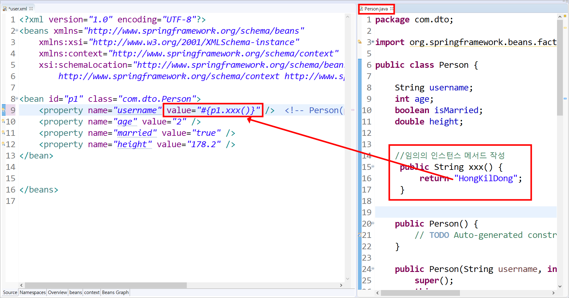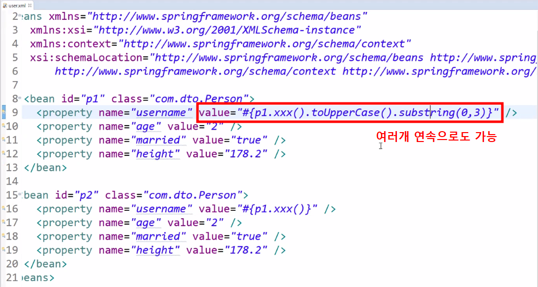 ✅ user.xml 에 value = "#{ id값.메서드이름( ) }"