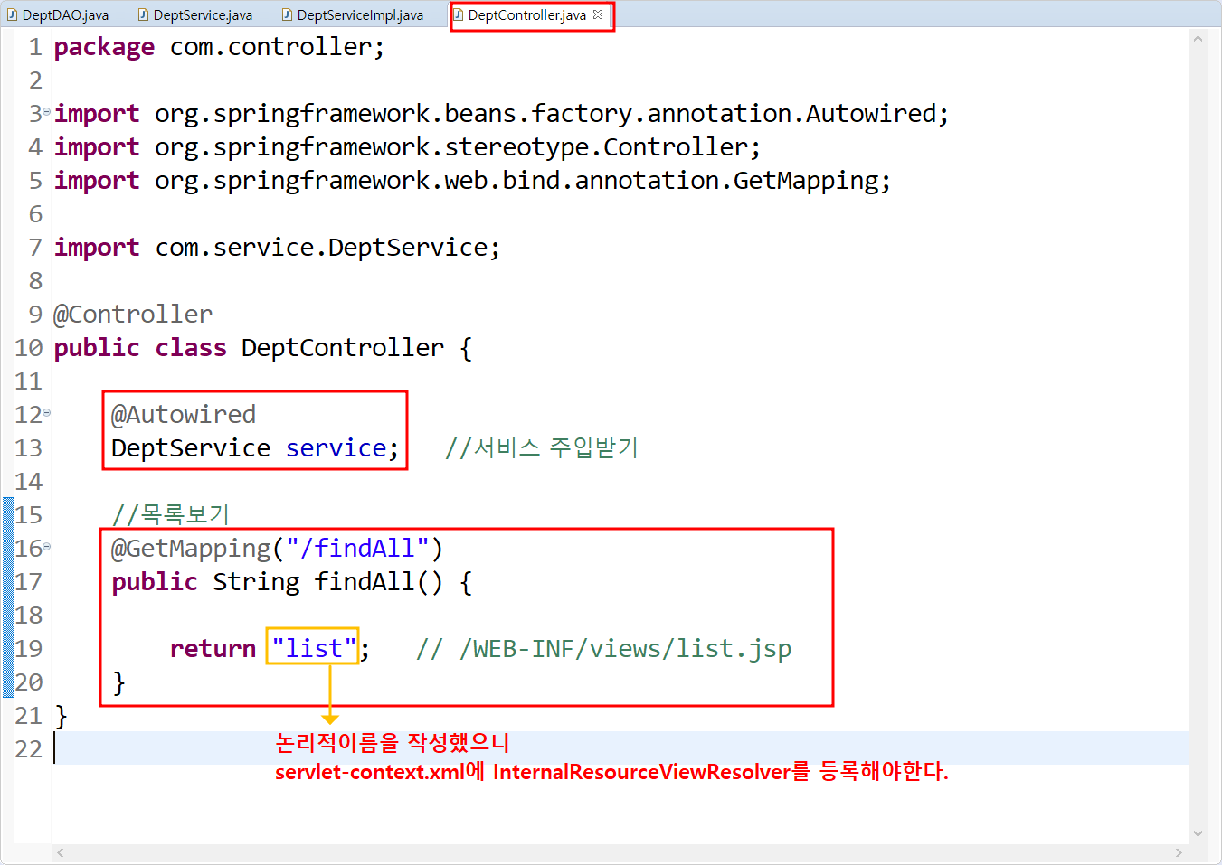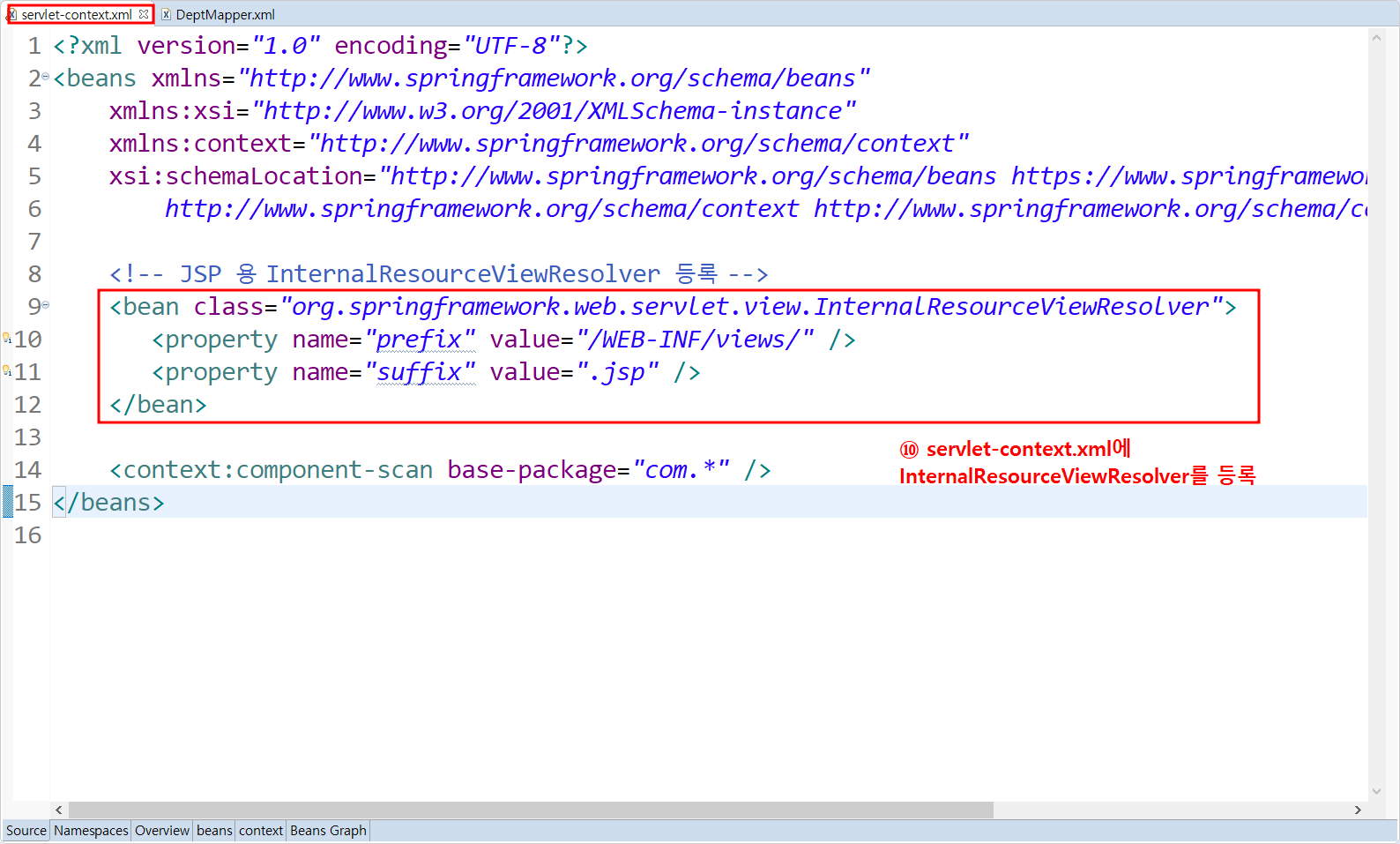 10. 논리적이름을 작성했으니 servlet-context.xml에 InternalResourceViewResolver를 등록해야한다.