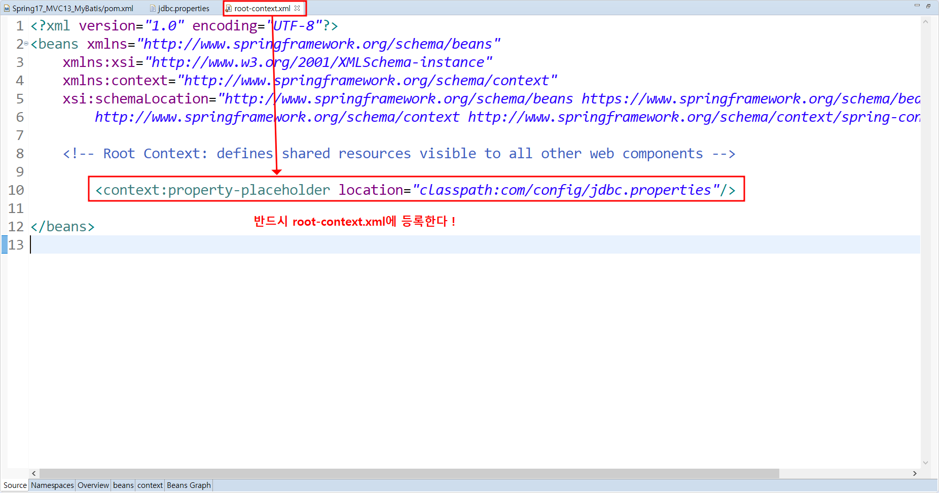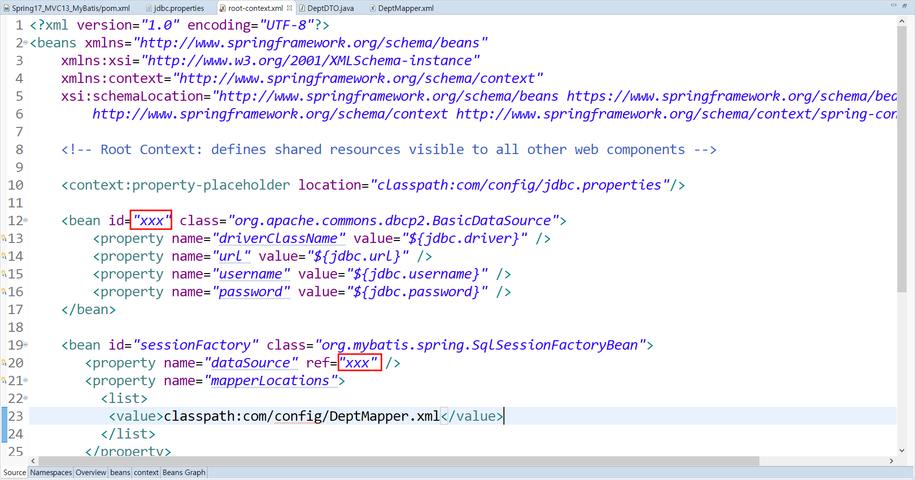3. jdbc.properties 등록된 4개의 정보를 이용해서 DB 연동하는 DataSource 설정