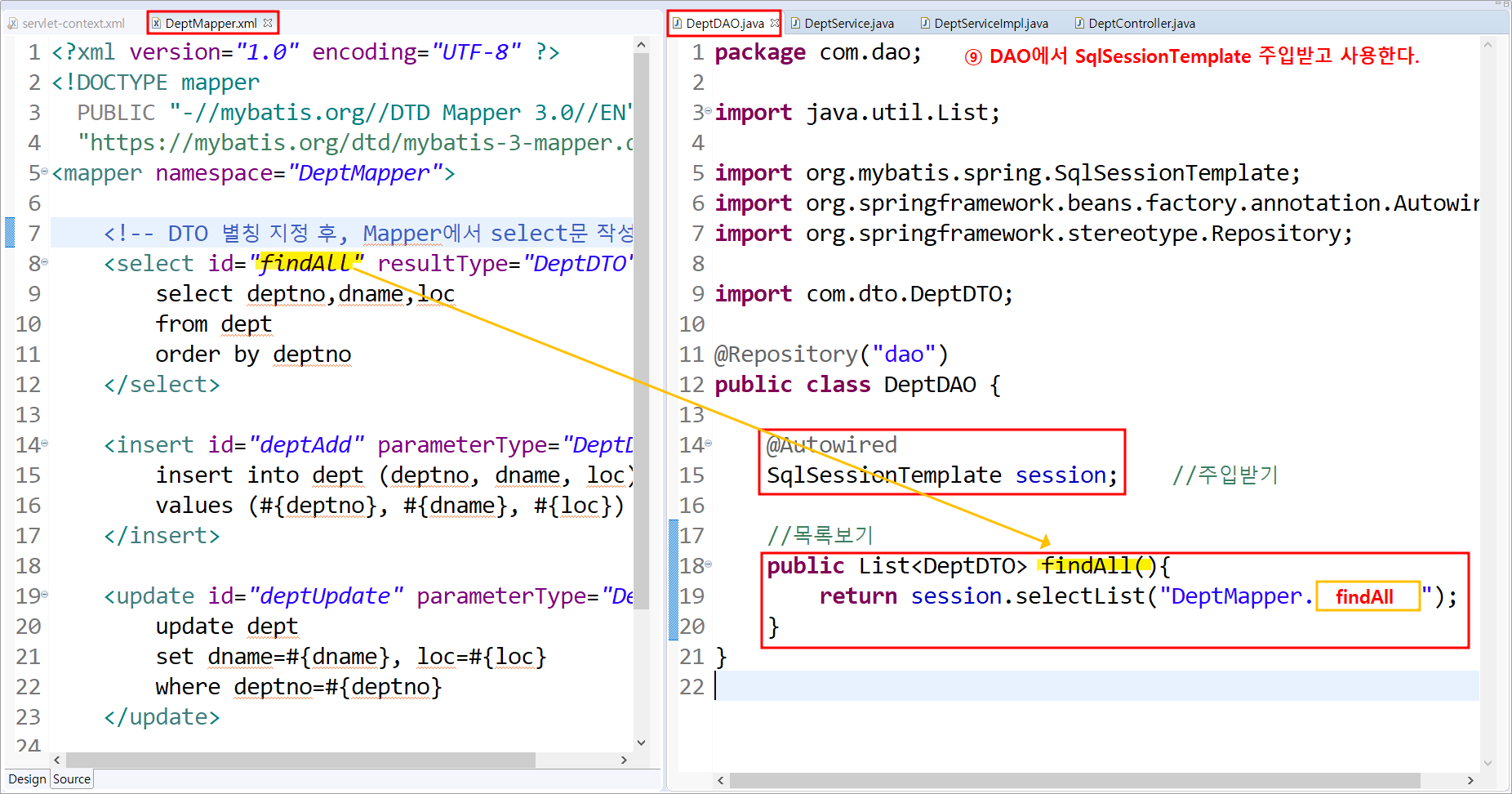 9. DAO에서 SqlSessionTemplate 주입받고 사용한다.