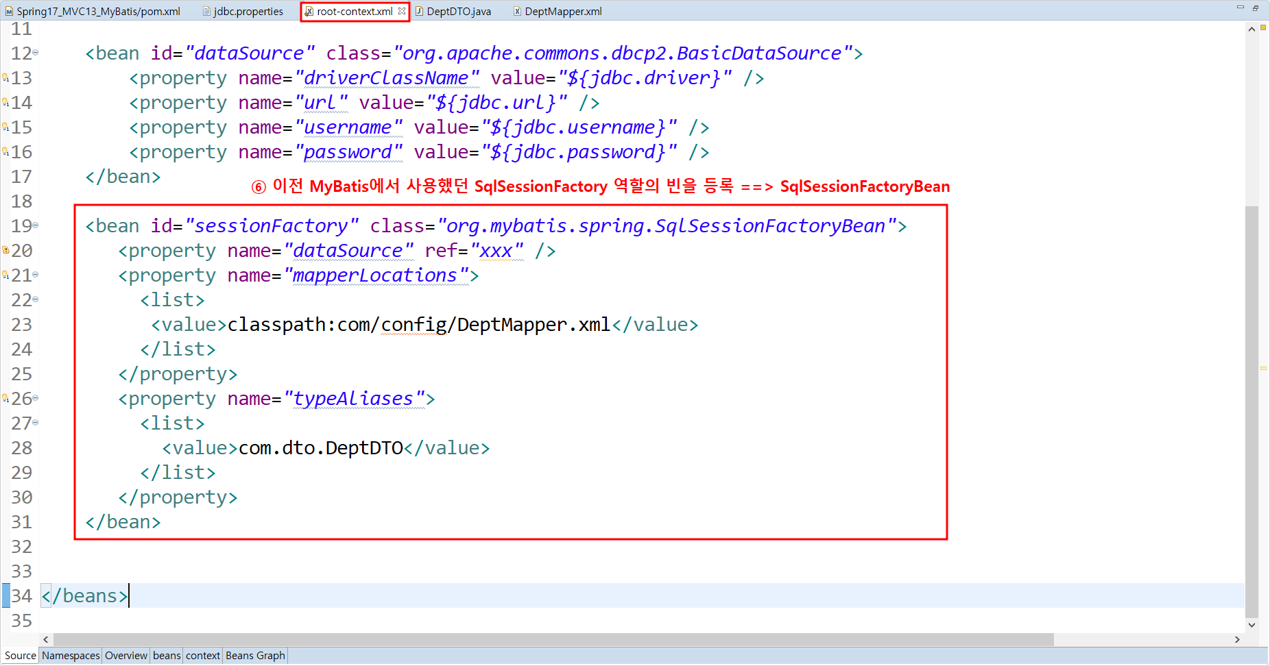 6. 이전 MyBatis에서 사용했던 SqlSessionFactory 역할의 빈을 등록 ⇒ SqlSessionFactoryBean
