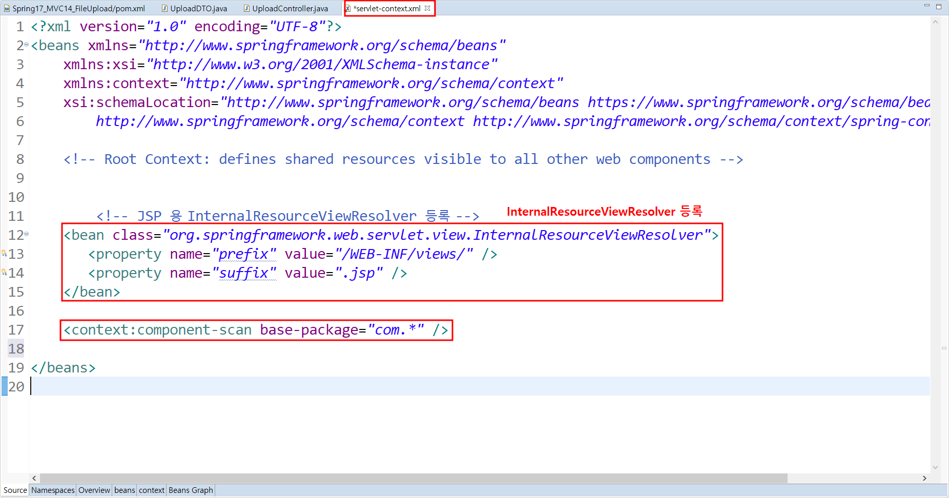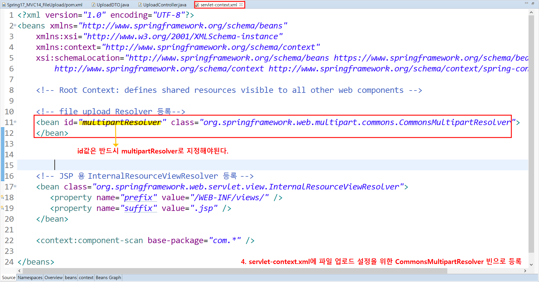 4. servlet-context.xml에 파일 업로드 설정을 위한 CommonsMultipartResolver 빈으로 등록