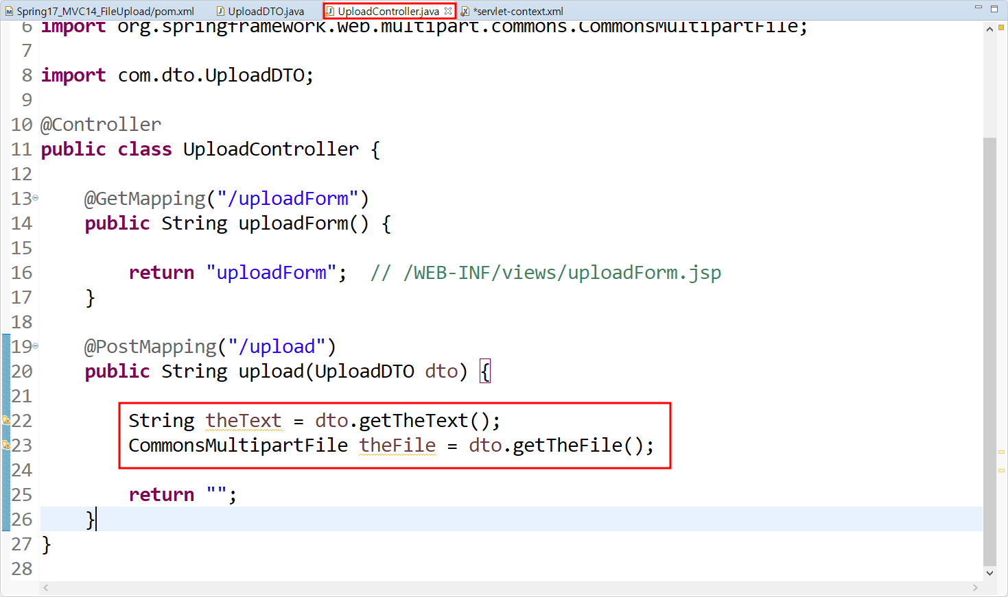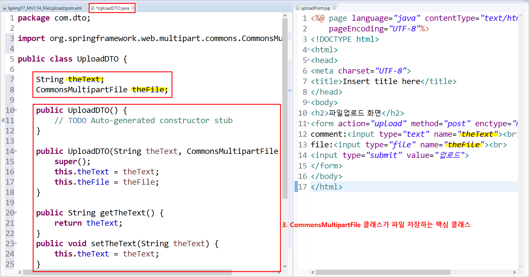 type=”text”와 type”file” 2개를 한꺼번에 저장하기 위해서 UploadDTO 클래스를 작성한다.
